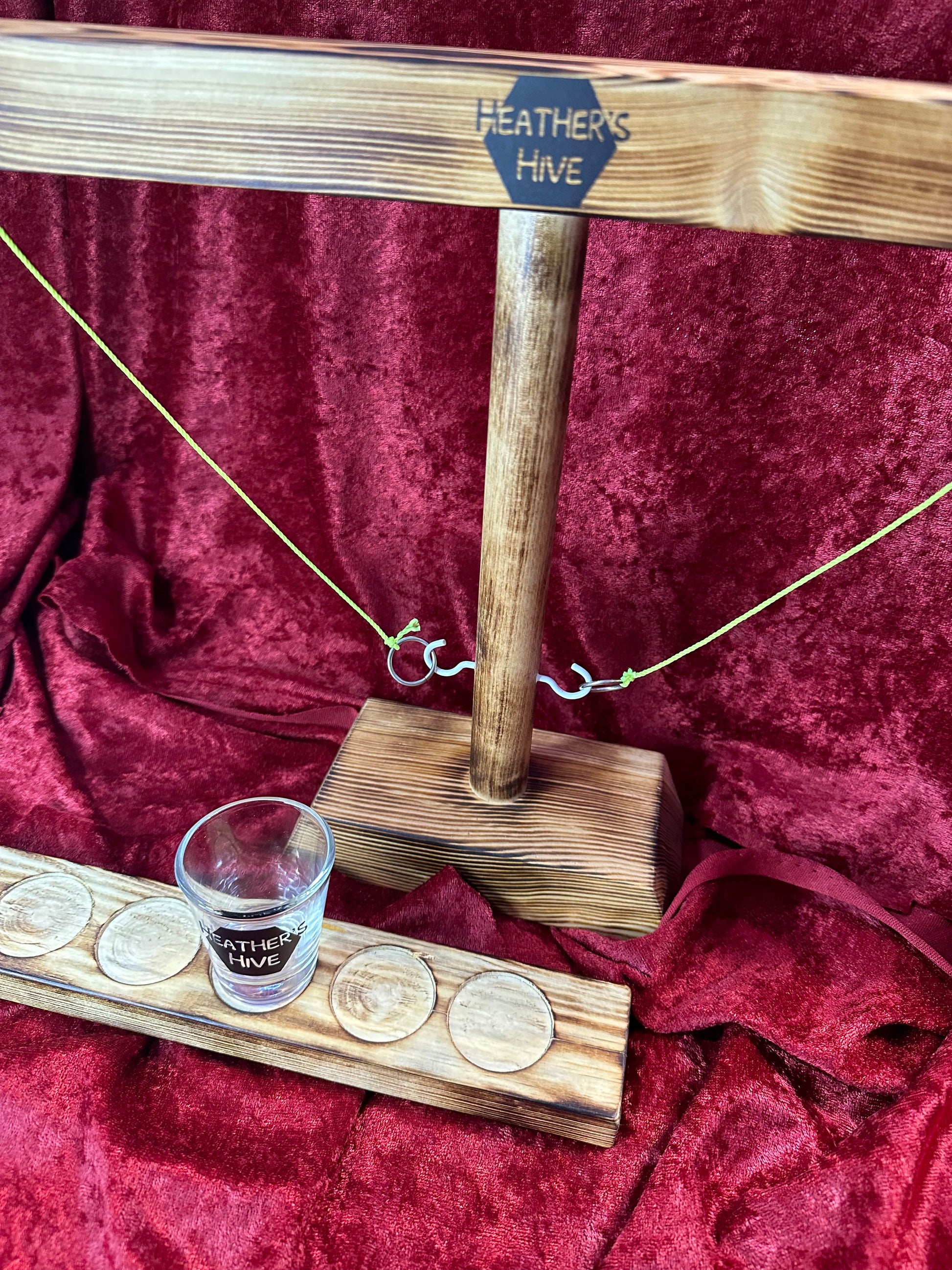 Handmade wooden ring toss game. Crafted from pine. Burnt and sealed. Includes shot glass.